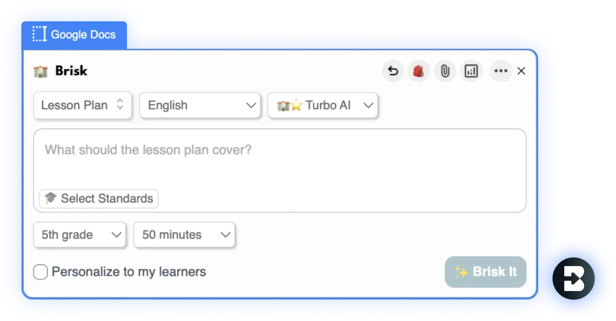 With Brisk’s seamless integration into tools you’re already using.  AI literacy can become part of the daily classroom routine. Use AI to create personalized learning experiences or show students how AI can be applied to real-world problems.