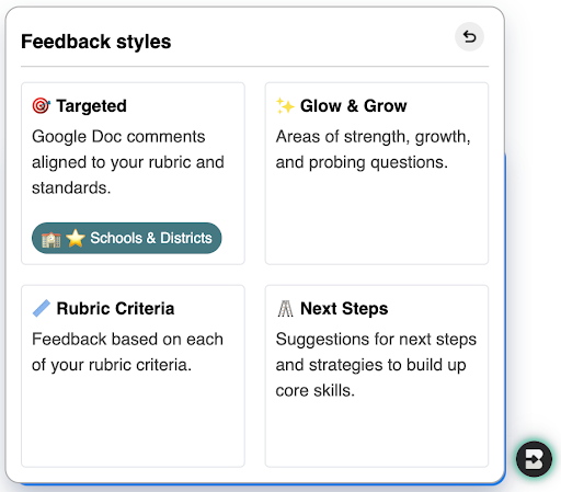 Masing-masing dari empat jenis umpan balik Brisk memungkinkan Anda menyelaraskannya dengan rubrik atau standar negara bagian Anda dan membagikannya dalam 20+ bahasa.