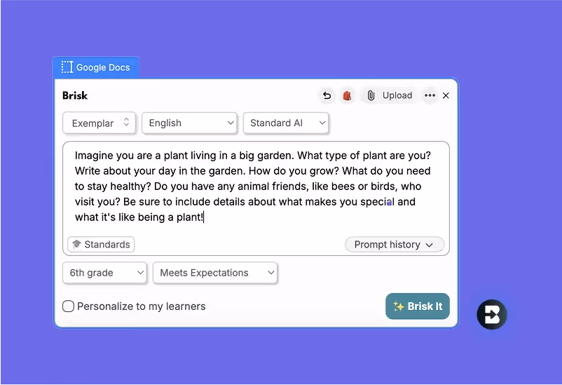 <div class="text-align-center" style="color: #ffffff !important;">No more blank stares when you say, "Write a strong paragraph!" Brisk’s Exemplar Tool instantly creates high-quality writing models for any prompt, grade level, or subject. Whether it’s a narrative, a research paper, or a reflection, Brisk sets the bar so students know what success looks like—without you having to write it yourself.</div>