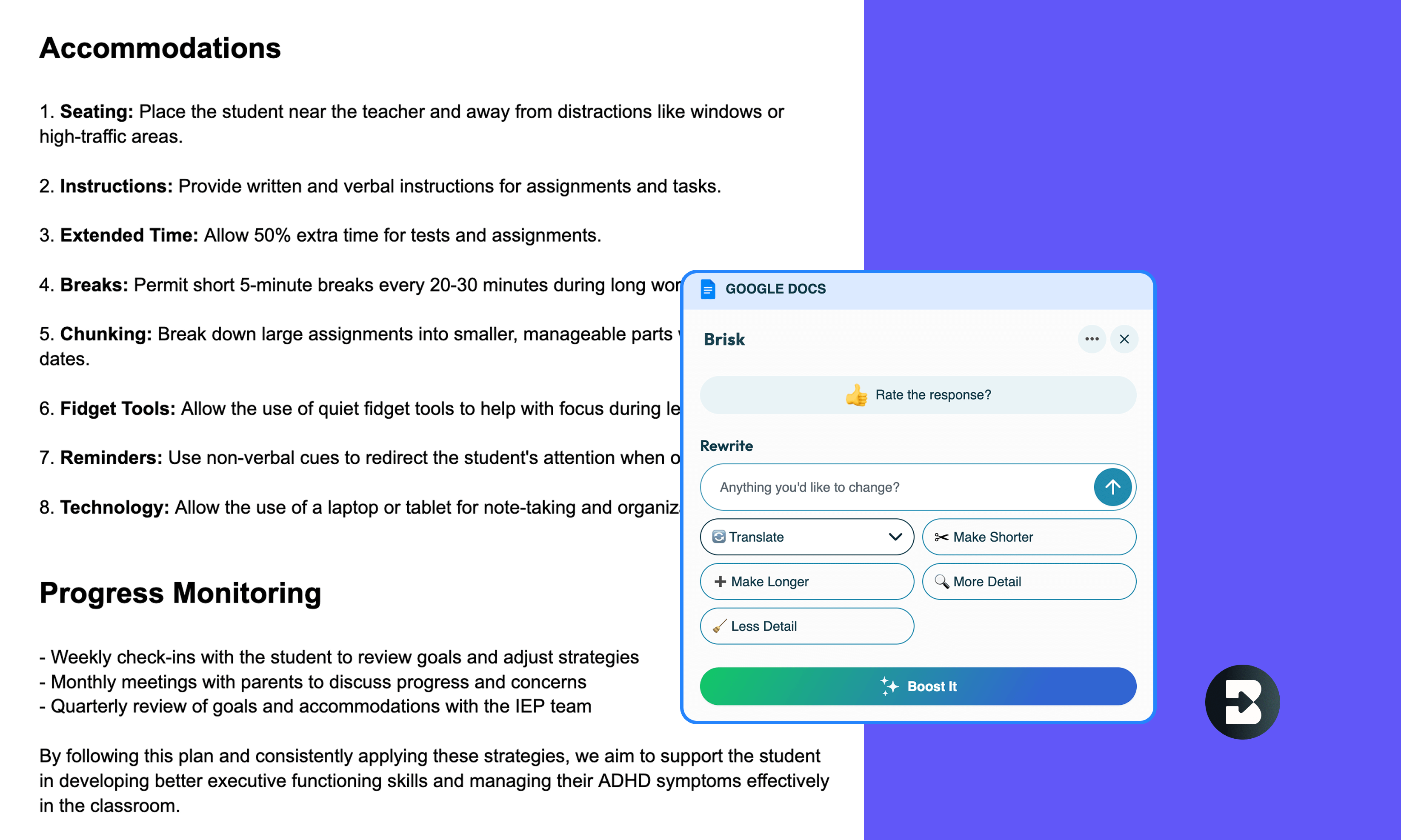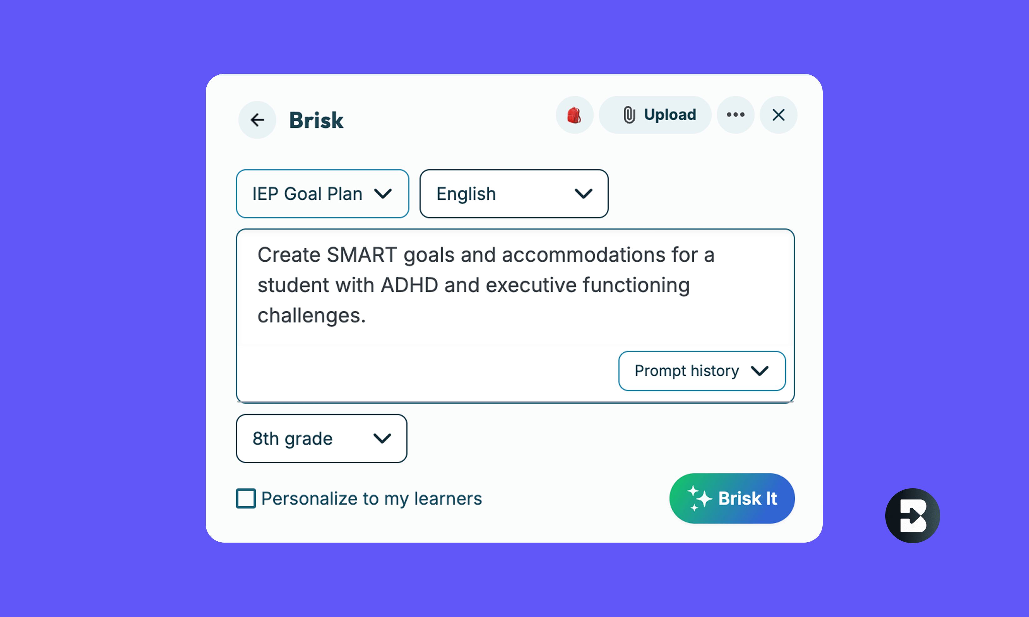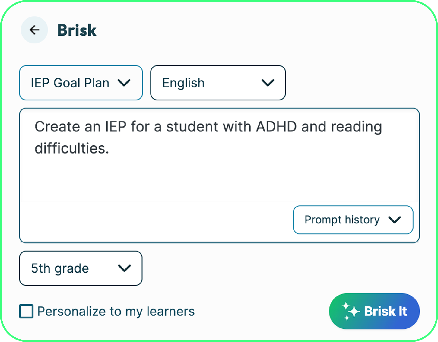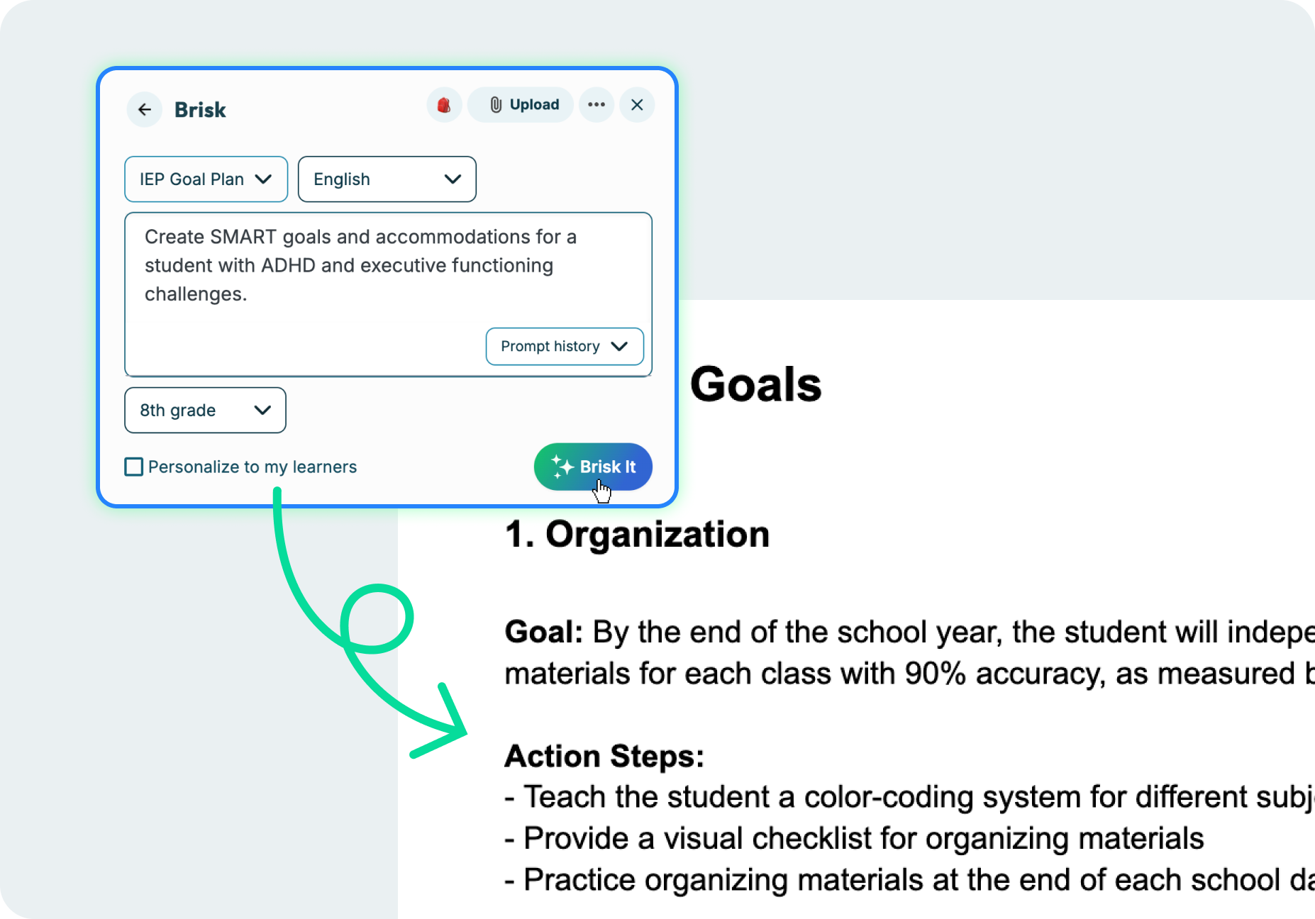 - Watch Brisk Work Its Magic: In seconds, you’ll have a robust IEP plan for your student.