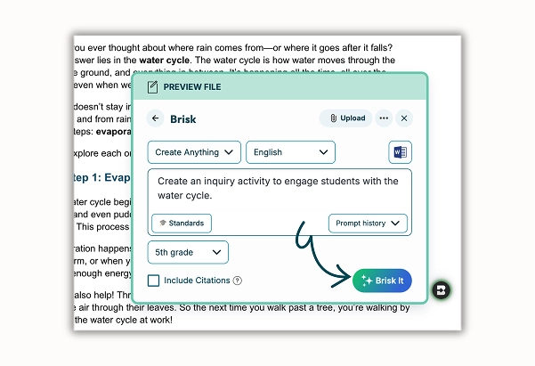 Bring in any Microsoft Word Doc file, PDF, image, or online article. Brisk tailors prompts questions and extensions for varied skill levels so each learner gets the right challenge.