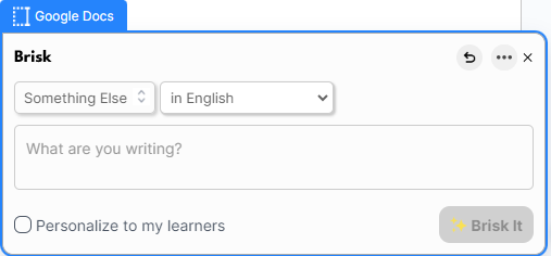 - Personalize suas opções. Um dos principais recursos do gerador de planilhas de IA da Brisk são suas opções flexíveis de personalização. Se você deseja criar uma planilha matemática simples ou um modelo complexo de experimento científico, o Brisk tem tudo para você. Escolha entre uma ampla variedade de tipos de conteúdo, incluindo matemática, ciências, artes da linguagem e muito mais, e especifique parâmetros adicionais, como nível de dificuldade, número de perguntas e tópicos específicos.