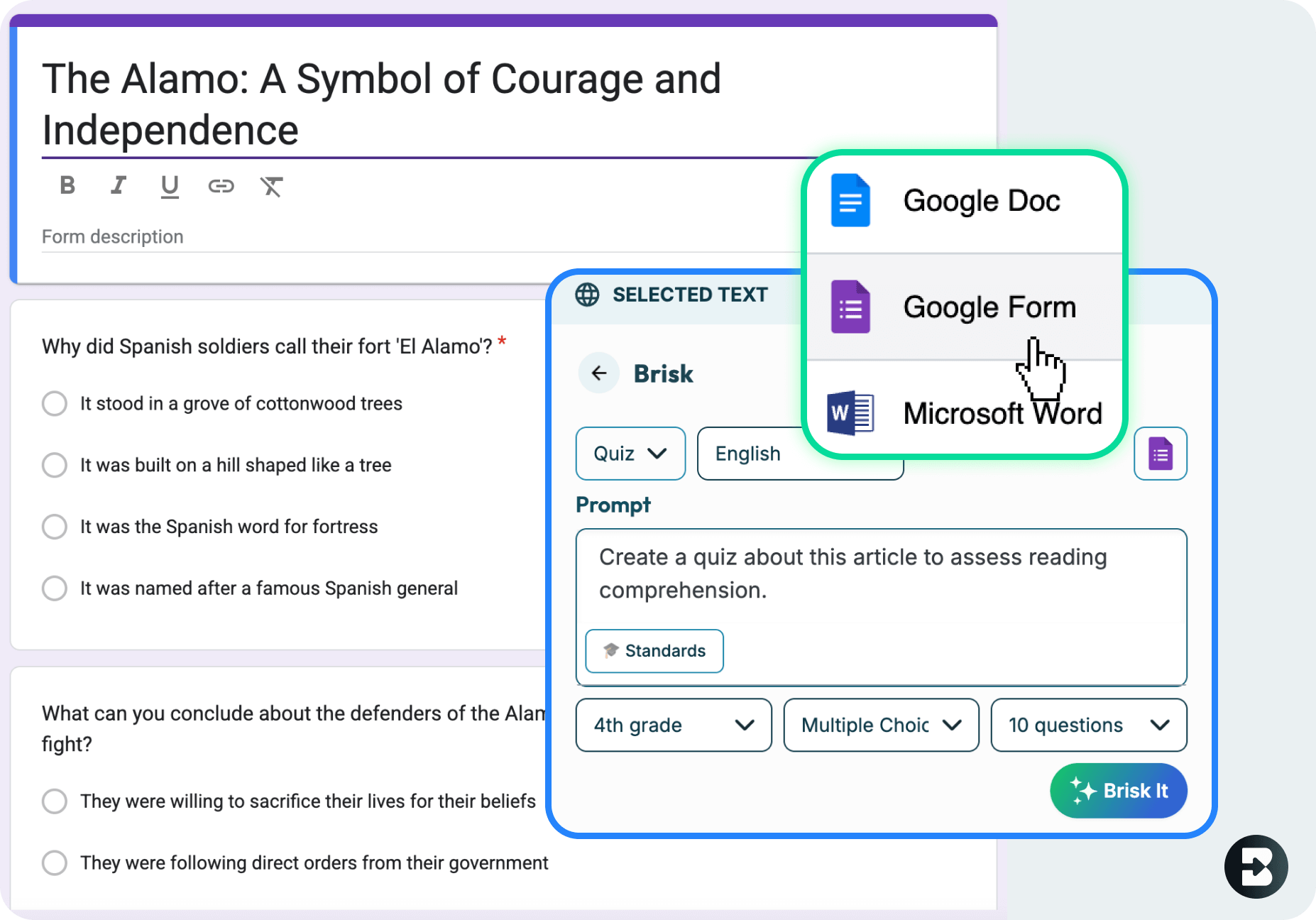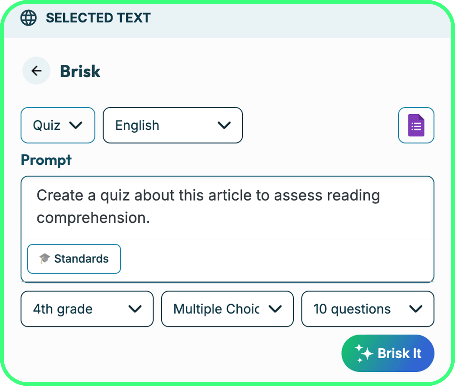 Brisk lives right in your browser. Highlight text or open a resource, click the Brisk icon, and generate a quiz without switching tabs or platforms.