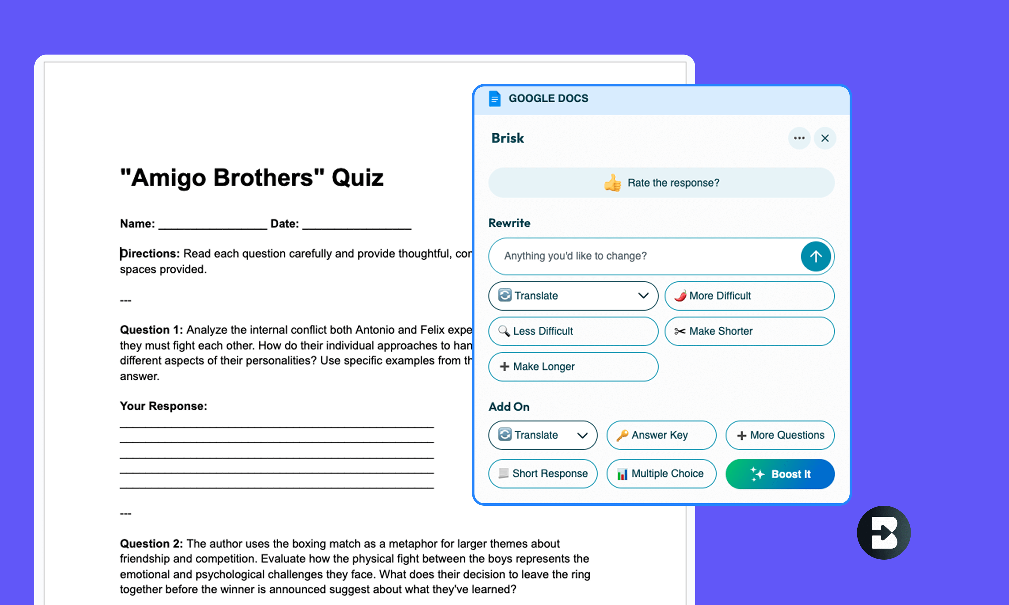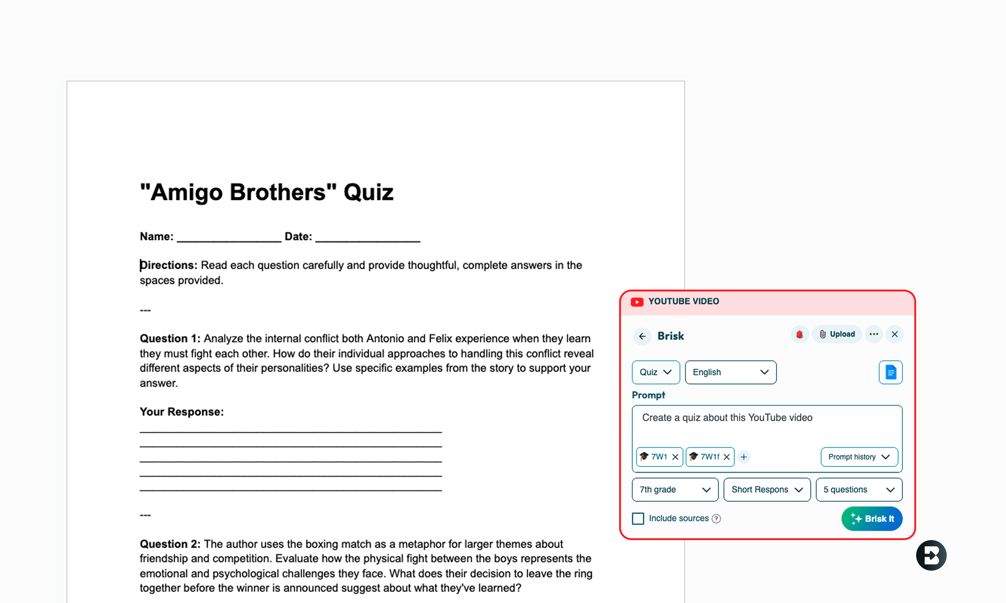 Brisk’s AI Quiz Maker turns any article, video, or resource into an auto-generated quiz in seconds. No more spending your evenings writing questions - now you can create checks for understanding in the click of a button.
