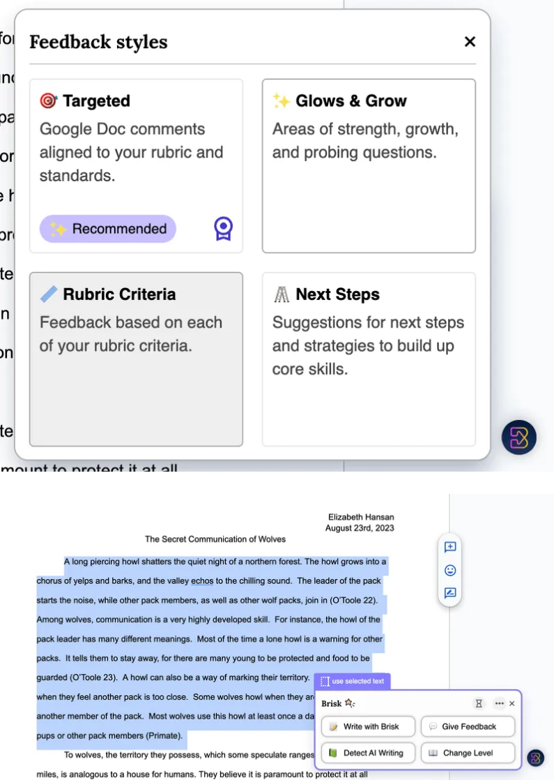 Vous en avez assez du copier-coller ? Nous avons élargi la section où vous pouvez créer et envoyer des commentaires ! Cliquez sur l'icône Brisk sur n'importe quel site Web ou document Google pour accéder instantanément aux options de feedback et à la section Créer une bibliothèque pour créer des questionnaires, des leçons, des ressources, etc.