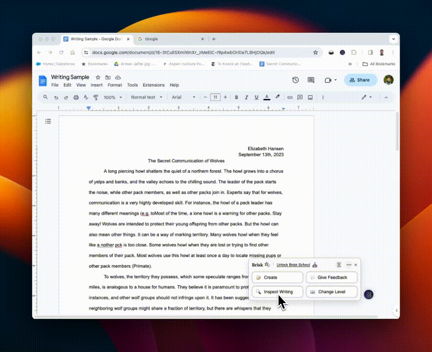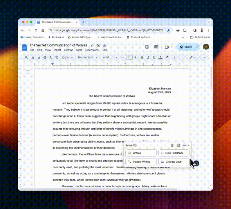 Ecco come: seleziona semplicemente un segmento di testo all'interno di qualsiasi documento, articolo, ecc. Quindi usa Brisk per fornire feedback, scrivere e generare risorse, rilevare la scrittura AI e/o modificare il livello di lettura su quel segmento.