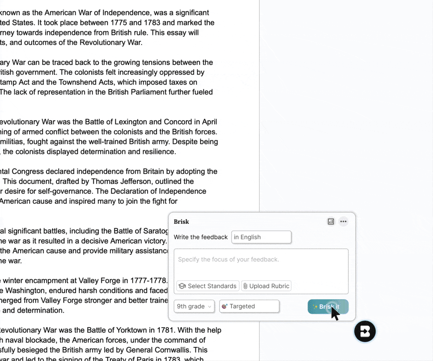 Masing-masing dari empat jenis umpan balik Brisk memungkinkan Anda menyelaraskannya dengan rubrik atau standar negara bagian Anda dan membagikannya dalam 20+ bahasa.
