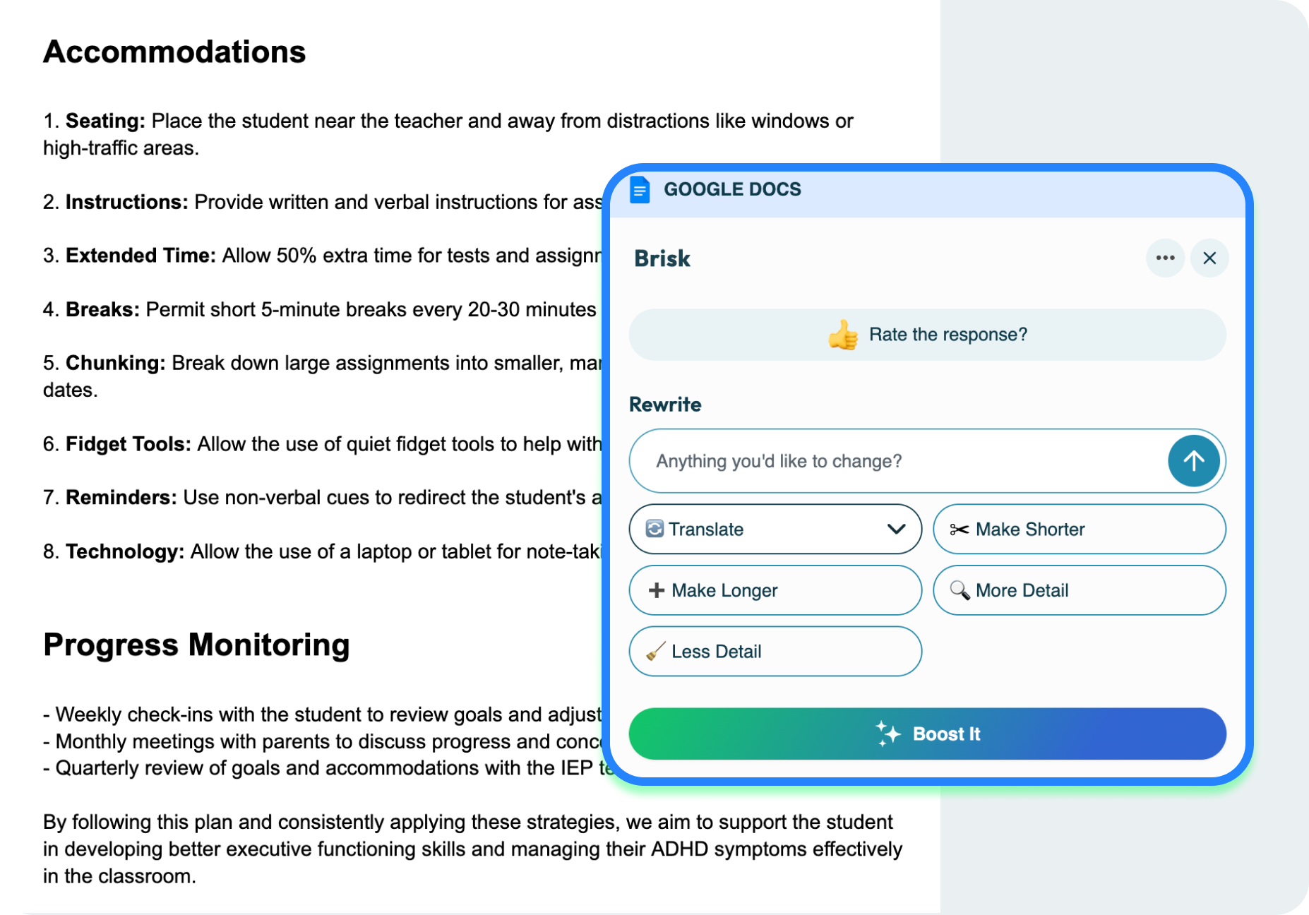 - Watch Brisk Work Its Magic: In seconds, you’ll have a robust IEP plan for your student.