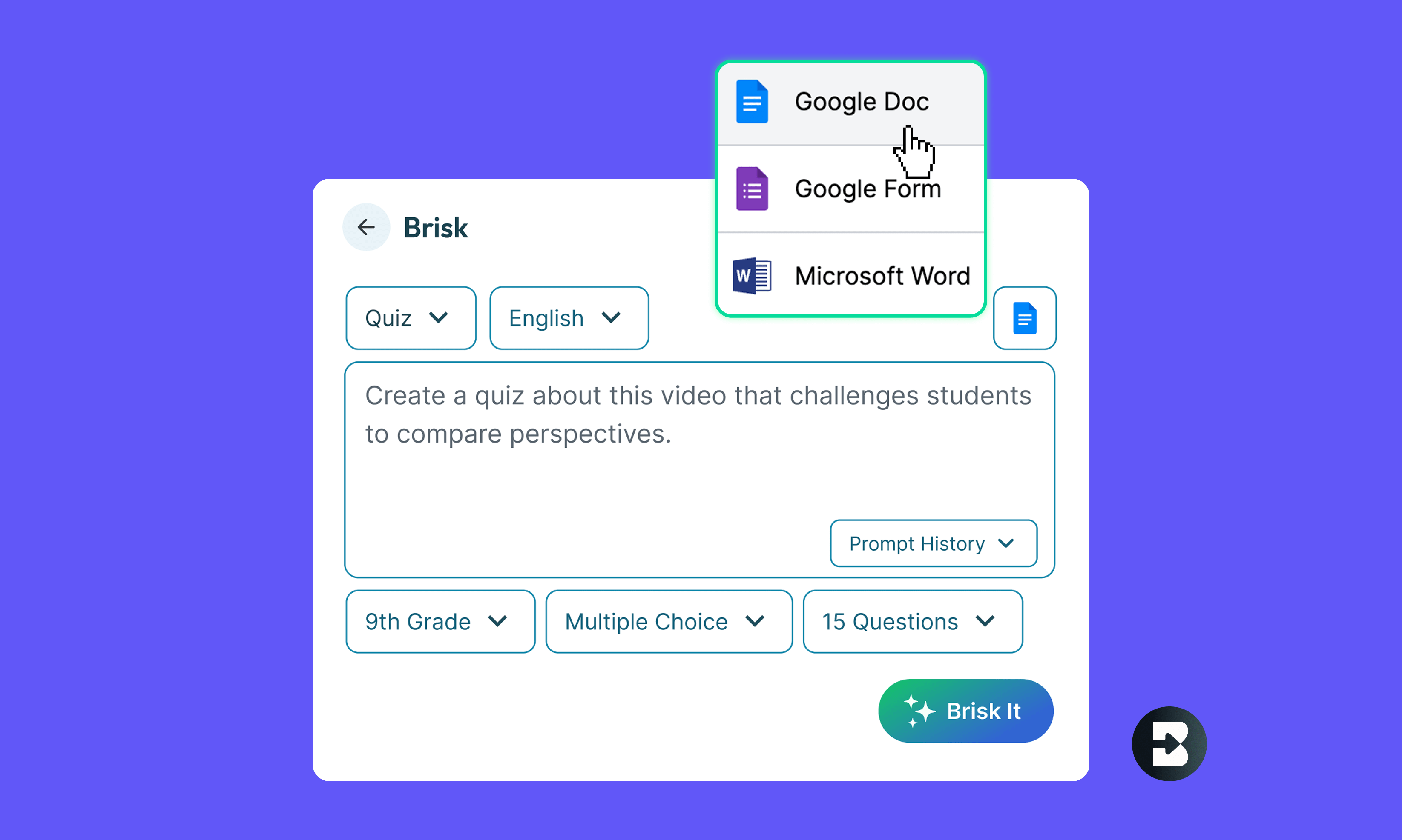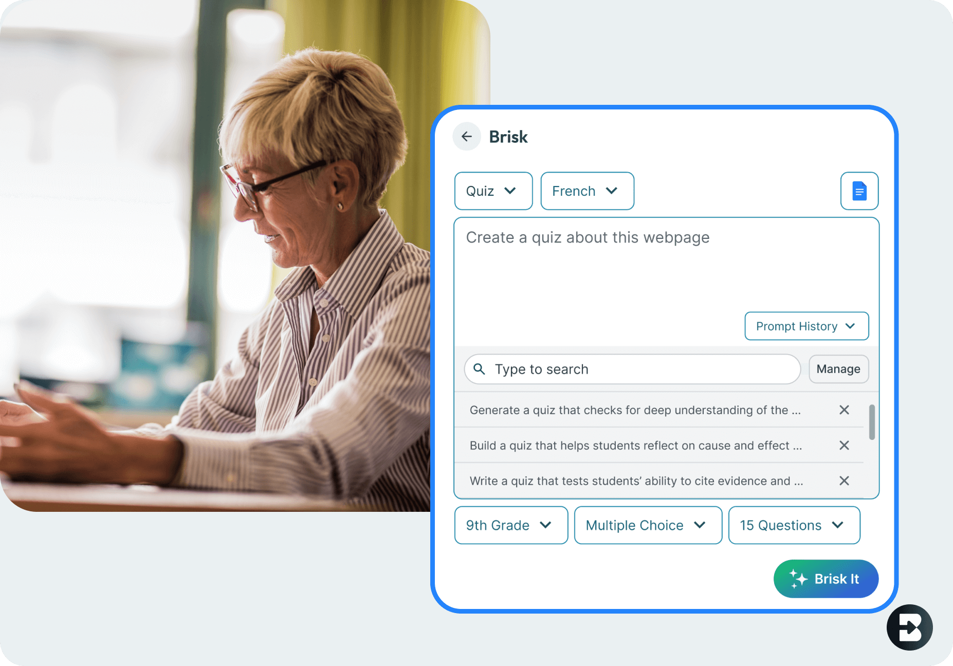 Brisk lives right in your browser. Highlight text or open a resource, click the Brisk icon, and generate a quiz without switching tabs or platforms.