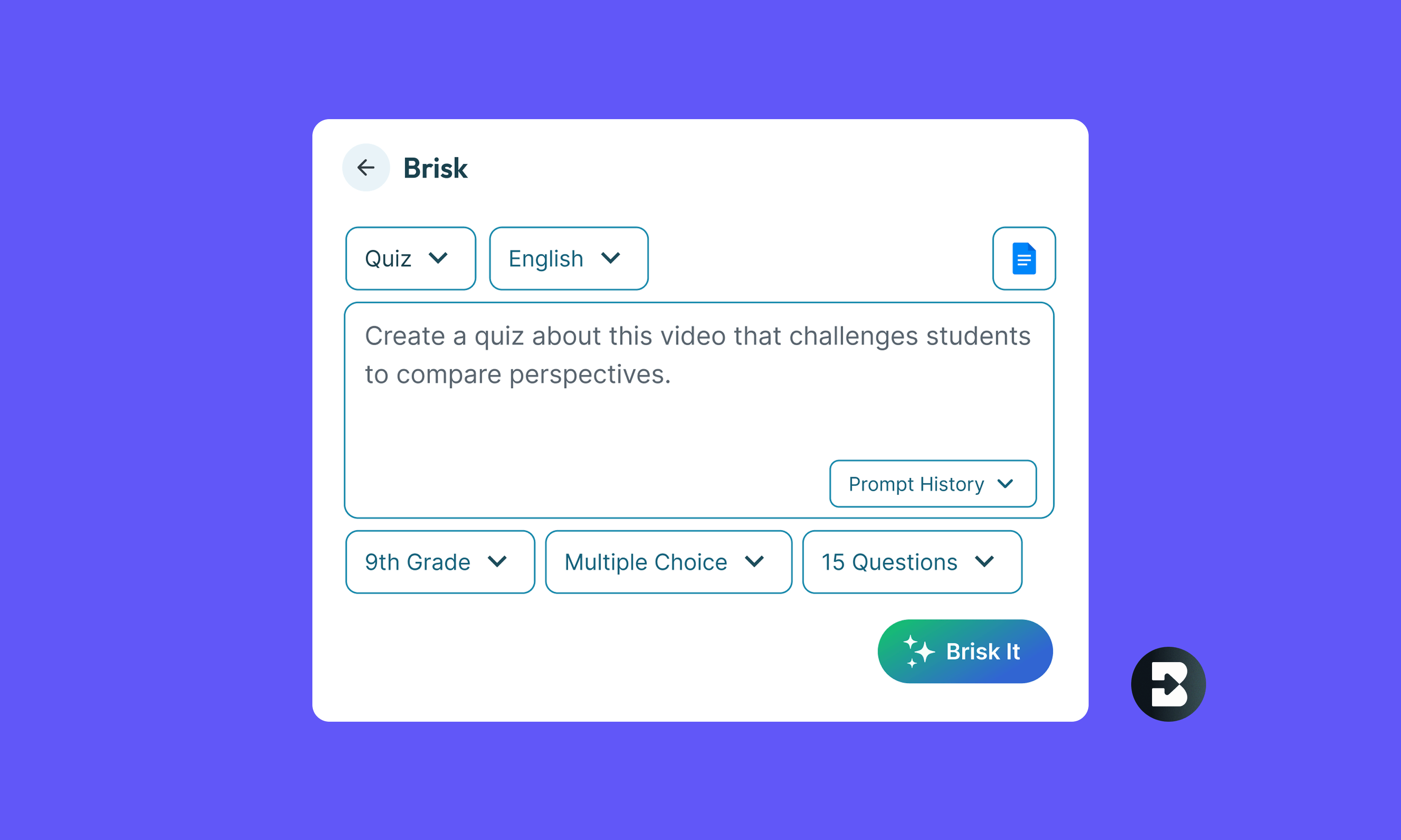 Brisk’s AI Quiz Maker turns any article, video, or resource into an auto-generated quiz in seconds. No more spending your evenings writing questions - now you can create checks for understanding in the click of a button.