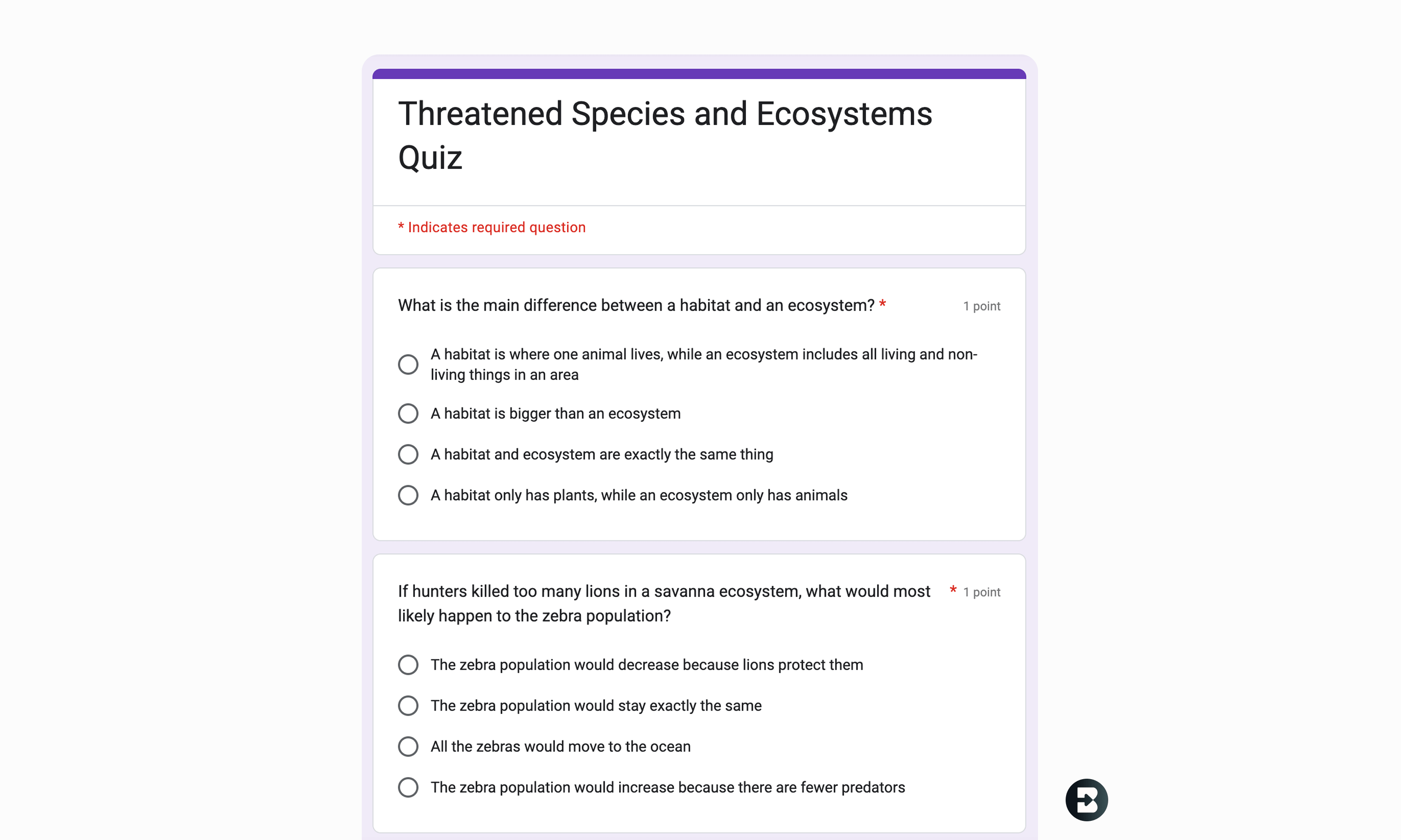 Choose grade level, question type (multiple choice, short answer, open-ended), number of questions, and how you want it delivered - Google Doc, Google Form, or Word Doc.