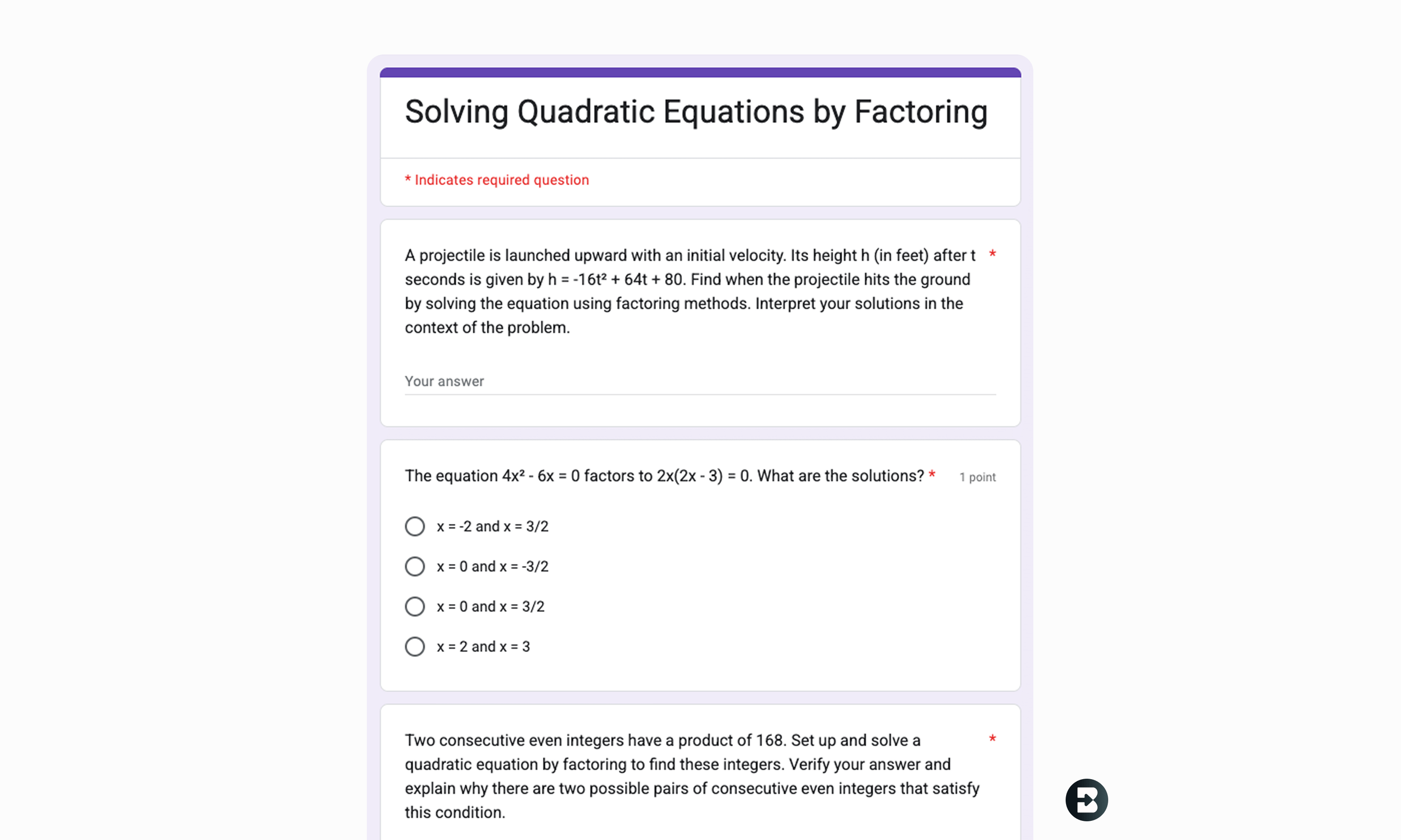 Generate a multiple-choice quiz from a lesson on quadratic functions. Export as a Google Form for fast grading.