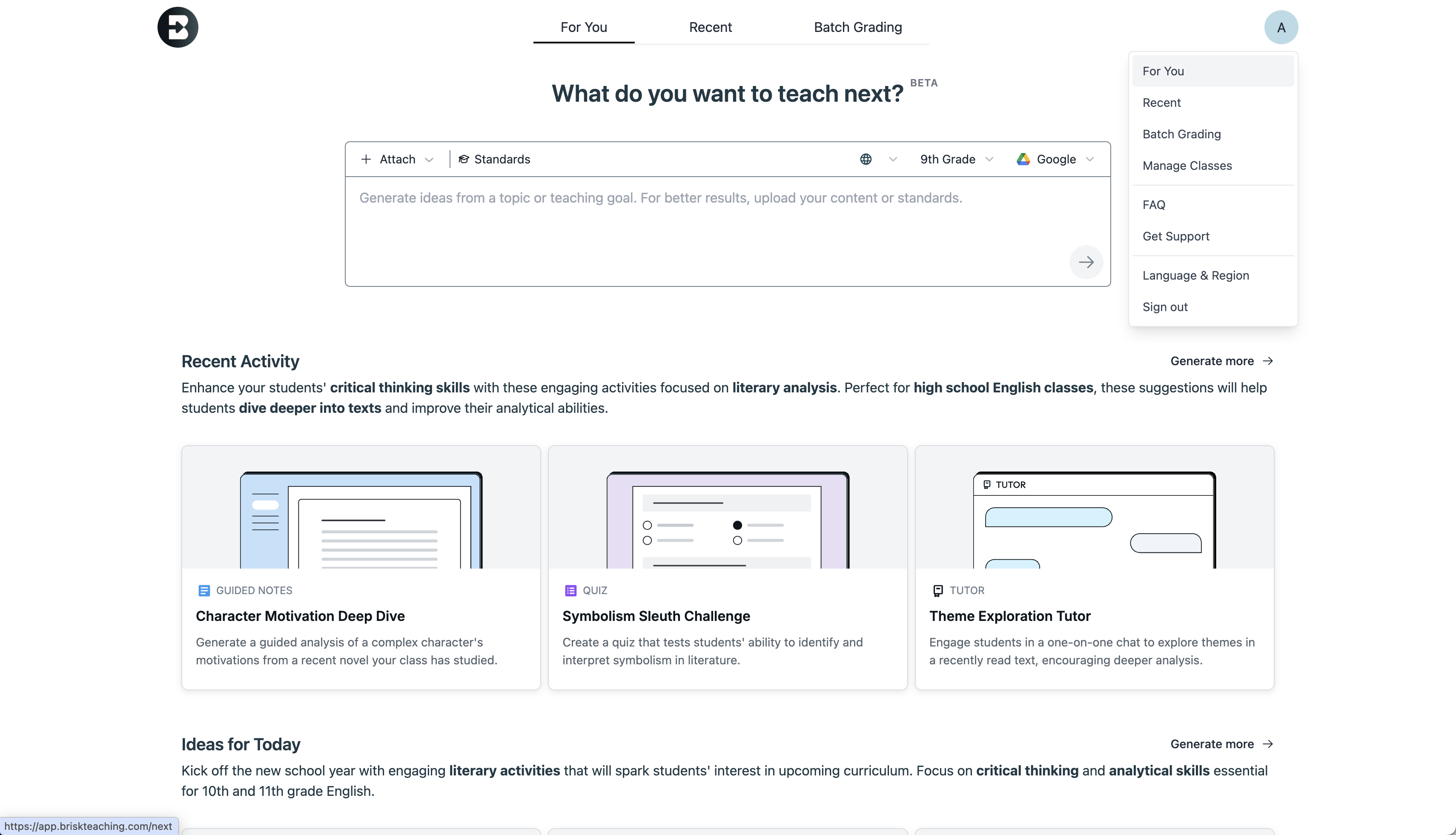 Brisk Next is here –– the new home base for teachers inside Brisk. With personalized recommendations, a chat to refine content, and the ability to bundle multiple resources into Boost activities, Brisk Next helps teachers plan, engage, and assess with ease. From surfacing tailored ideas based on your recent work and student insights to keeping all your generated materials in one place, Brisk Next goes beyond the extension — turning classroom data into powerful next steps and making it easier than ever to figure out what’s next in your teaching.